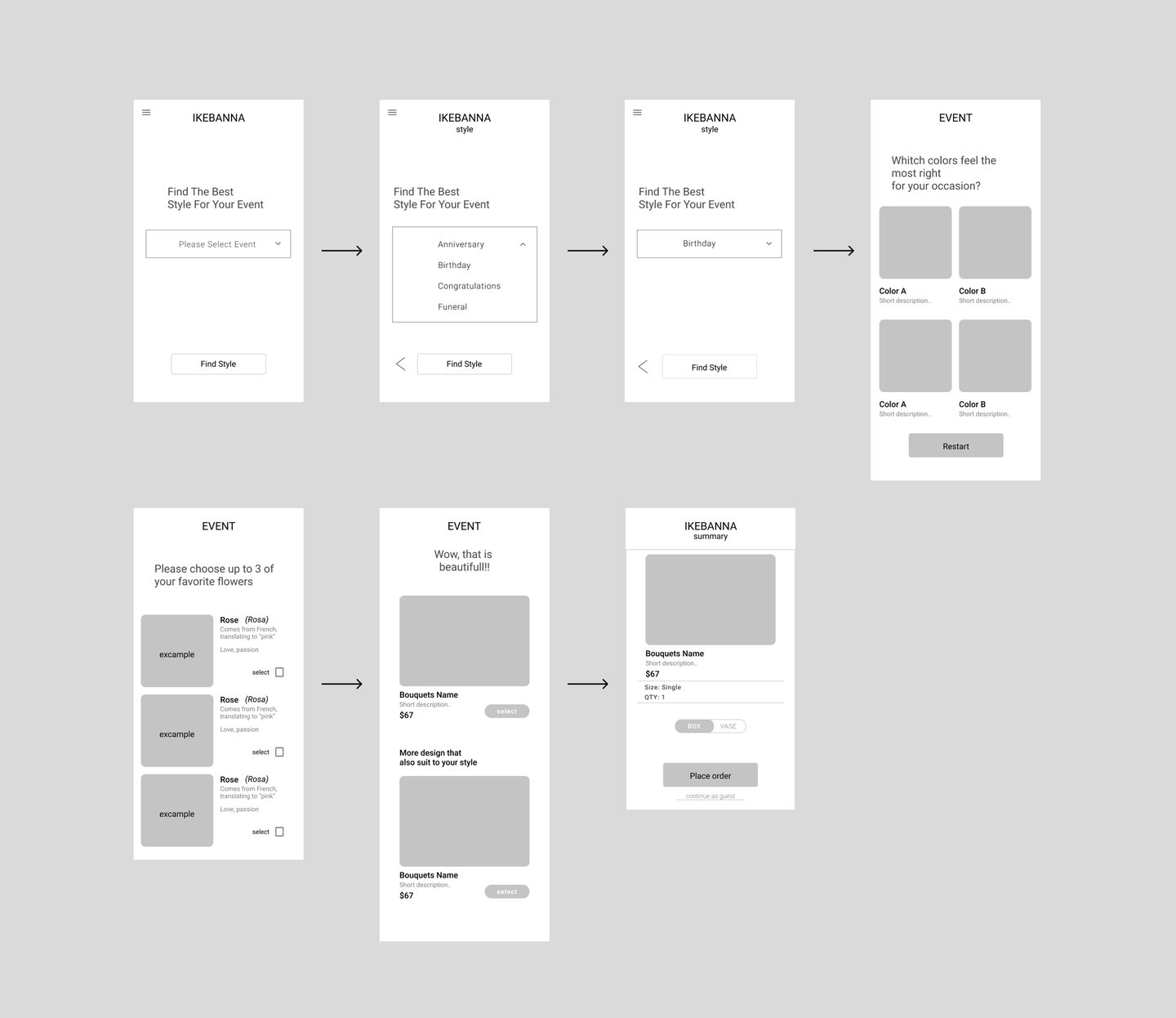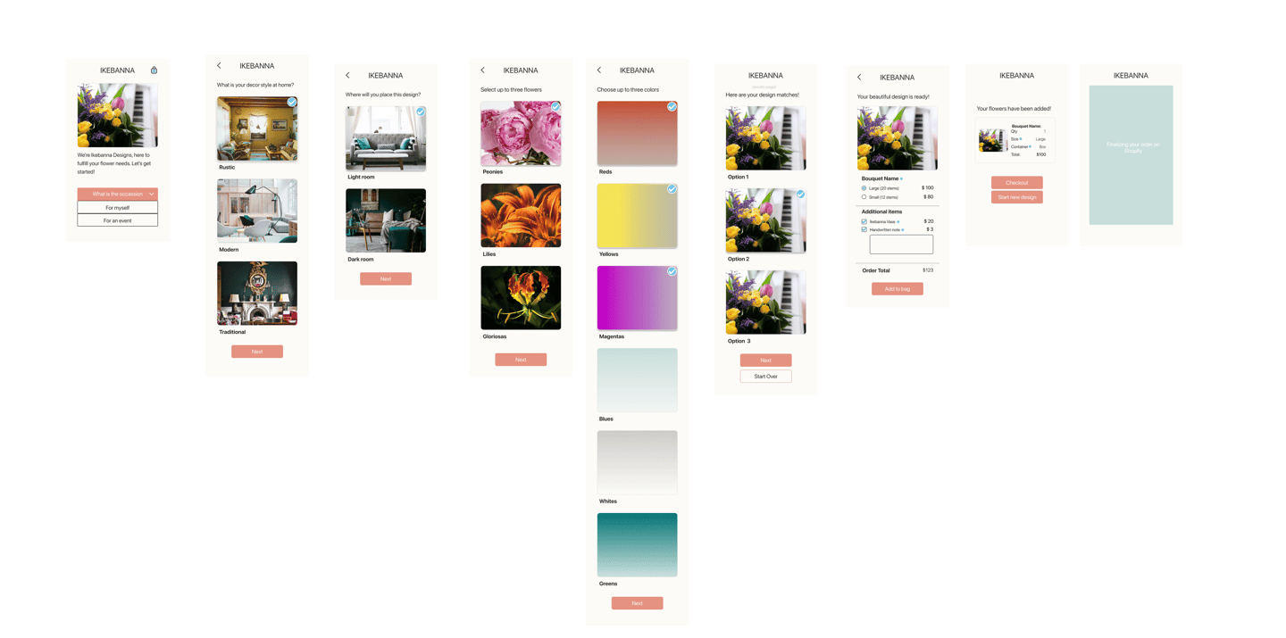 Ikebanna is a mobile app concept brought to me by a client who needed guidance on crucial design decisions. The app allows customers to browse premium flowers and create personalized arrangements for any occasion. Together, we refined the original concept through thoughtful design exploration, iteration, and testing to ensure it effectively meets the problem presented to users.