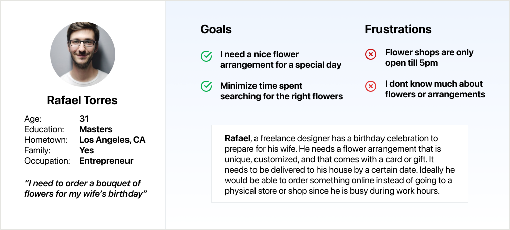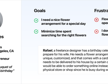 Primary User Group: My research identified working adults as a key user group, particularly those needing flower arrangements for special occasions but lacking the time to visit a physical store. Beyond time constraints, these users also faced challenges such as balancing other obligations, limited knowledge of flower types, and difficulty in selecting the right flowers for specific occasions.